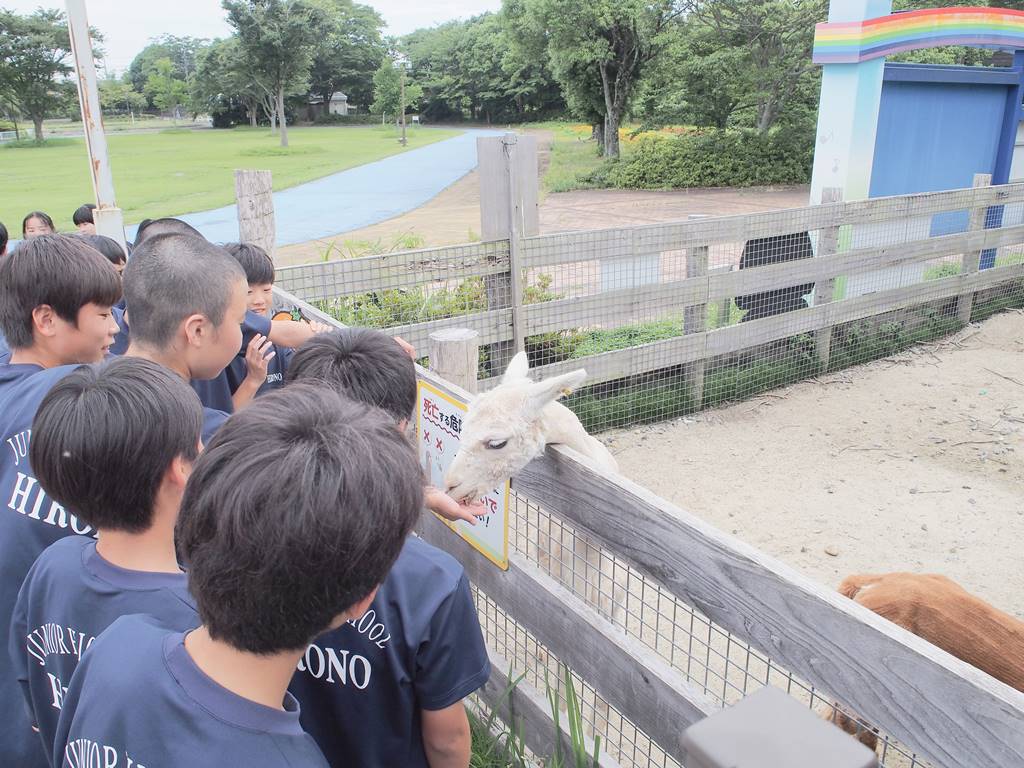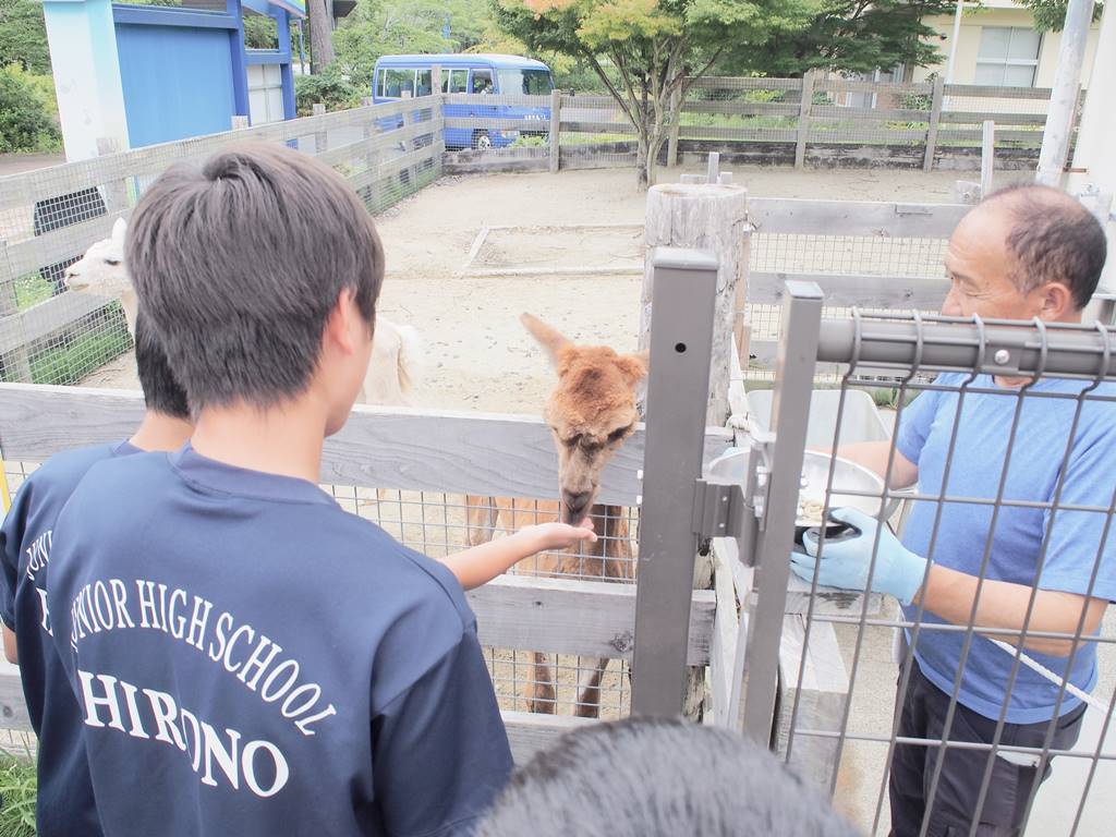 広野中学校様が見学にいらっしゃいました [ フルーツ栽培 ] 2024年7月4日(木曜日) 令和6年7月3日(水)に広野中学校1年生40名様が見学にいらっしゃいました。 被災地広野町の新たな創生に向けた取り組みを聞かれた後、2班に分かれてハウス見学とアルパカの見学へ行かれました。ミルクとココアにおやつをあげたり、ハウスで「綺麗」の葉っぱの枚数をクイズでださて、それぞれが思った枚数を答えていました。小学生の時に「綺麗」の採取で来られたという生徒もいました。