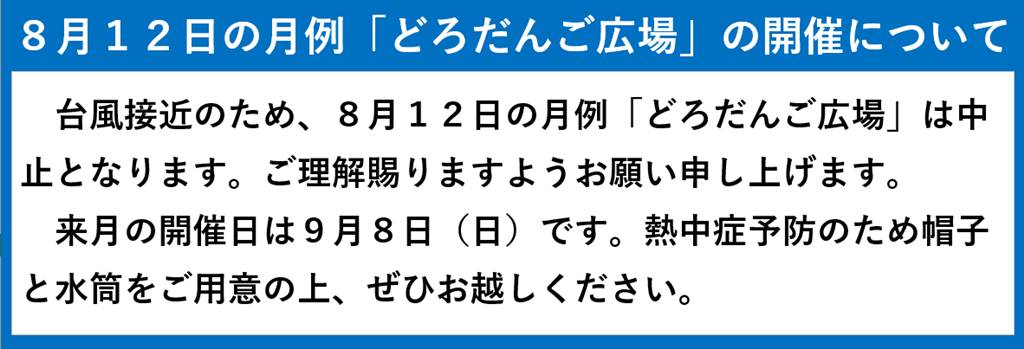 8/12の月例「どろだんご広場」は中止します