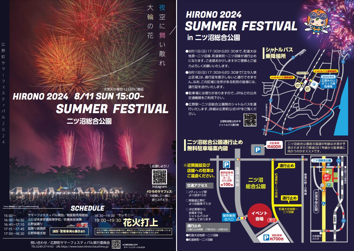 物産販売や、福島県立ふたば未来学園高等学校 吹奏楽部 演奏、広野盆踊り、広野昇龍太鼓、花火打ち上げなどの催しがあります。