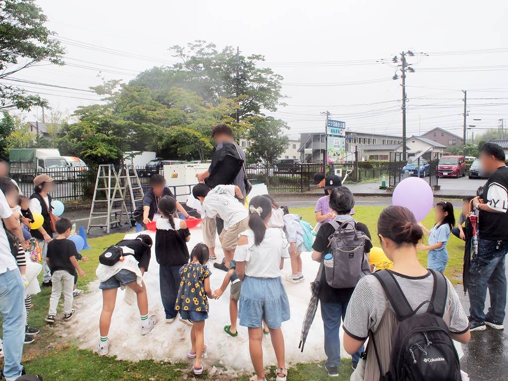 交通教室広場には、動物とふれあえるコーナー、バッテリーカーの試乗、スノーマシンでつくった雪山があり、他に正門から体育館の間をミニトレイン号で移動ができるなど、こども達が喜ぶコンテンツが多くありました。