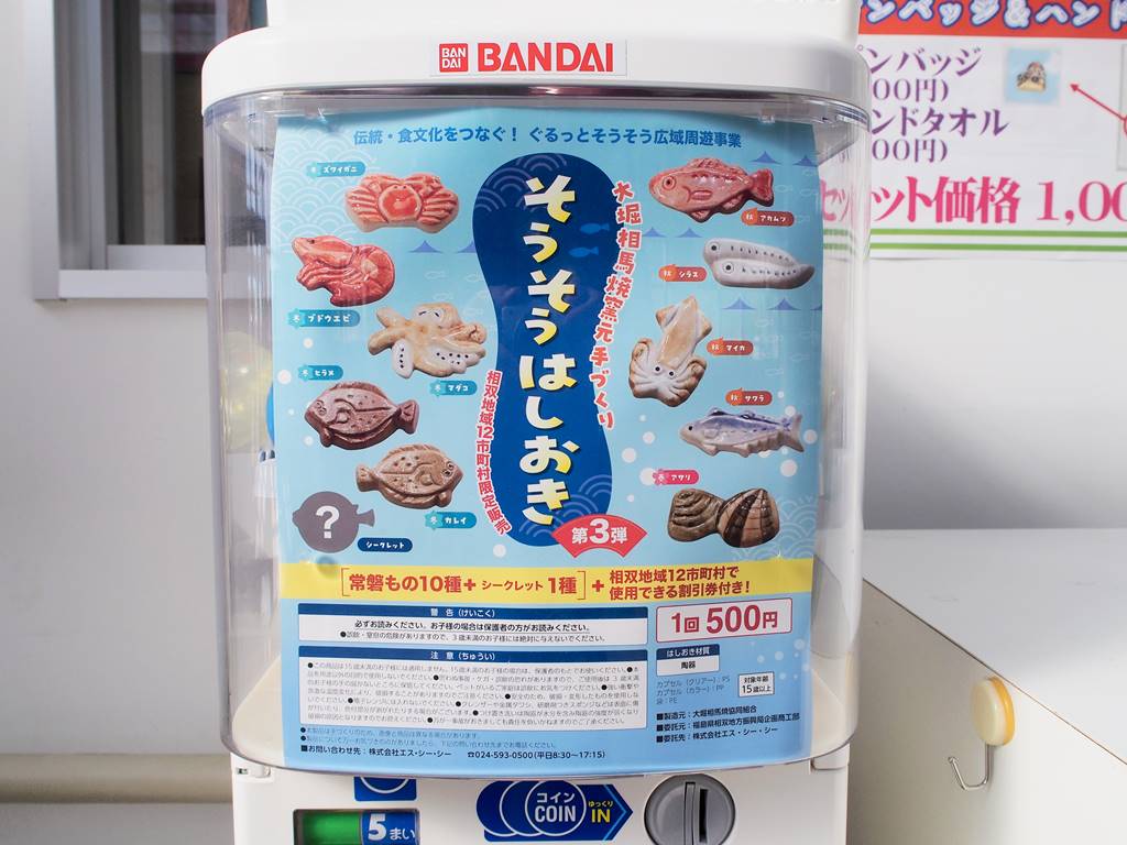 10/12 そうそうはしおきガチャ第三弾が販売開始 [ 新着情報 ] 2024年10月13日(日曜日) 令和6年10月12日から「そうそうはしおきガチャ第三弾」が販売開始しました。設置場所はトロピカルフルーツミュージアム内で、料金は1回500円。大堀相馬焼のオリジナルはしおきと、12市町村の施設・店舗で使える割引券がセットで入っています。今回のモチーフは常磐もので、通常デザインが10種類と、シークレットが1種類の計11種類。販売は令和7年2月中までの予定ですが、なくなり次第終了です。皆さま、ぜひお立ち寄りください。