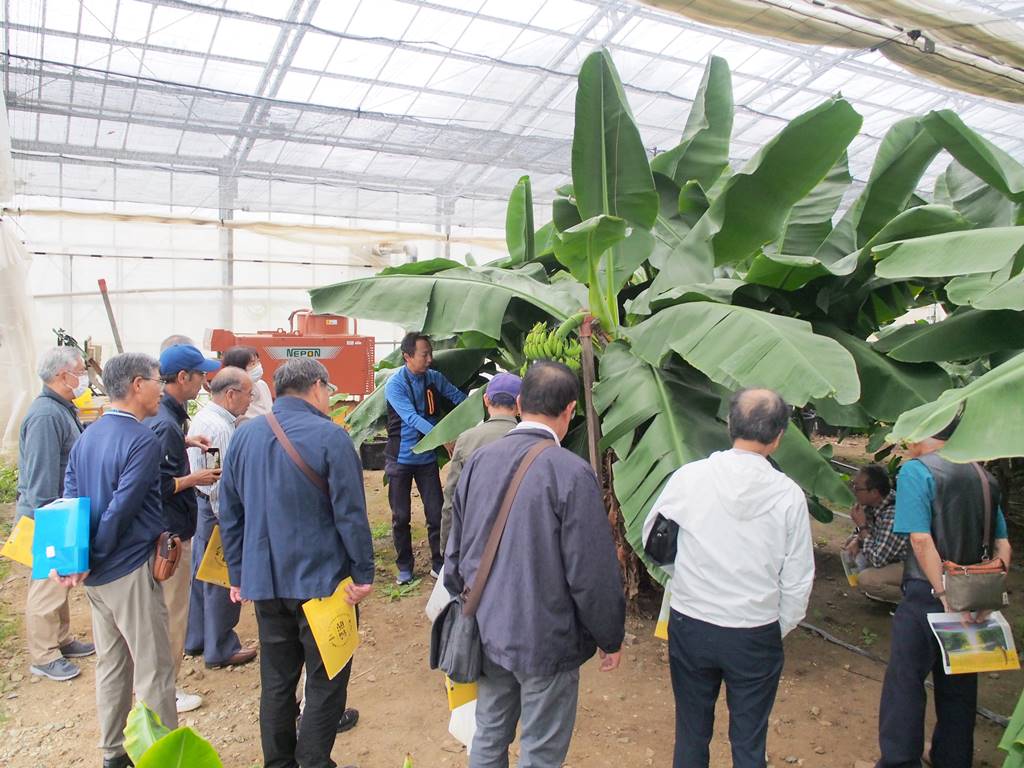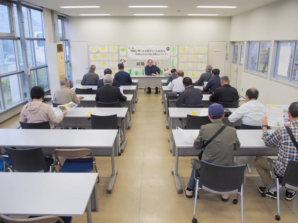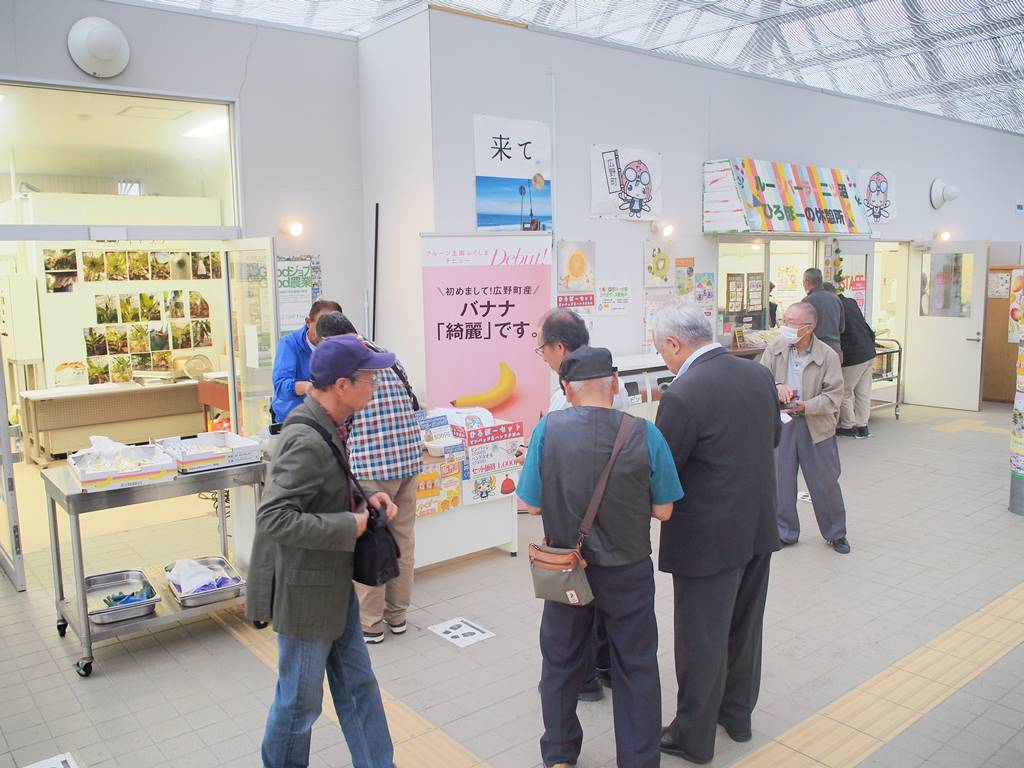 三春町まちづくり協会様が視察にいらっしゃいました [ フルーツ栽培 ] 2024年10月18日(金曜日) 令和6年10月18日(金)に三春町まちづくり協会様が視察にいらっしゃいました。 時間が限られていたため、最初に「綺麗」やみかんサイダーの販売を行いました。バナナジュースやバナナシェイクの注文も受け、出来上がり次第お届けしました。注文された方はバナナジュース等を飲みながら被災地広野町の新たな創生に向けた取り組みを聞かれました。次にビニールハウスへ移動し、「綺麗」を見学されました。バナナの花はどういう花か、といった質問をされたりなど、真摯に説明を聞かれていました。