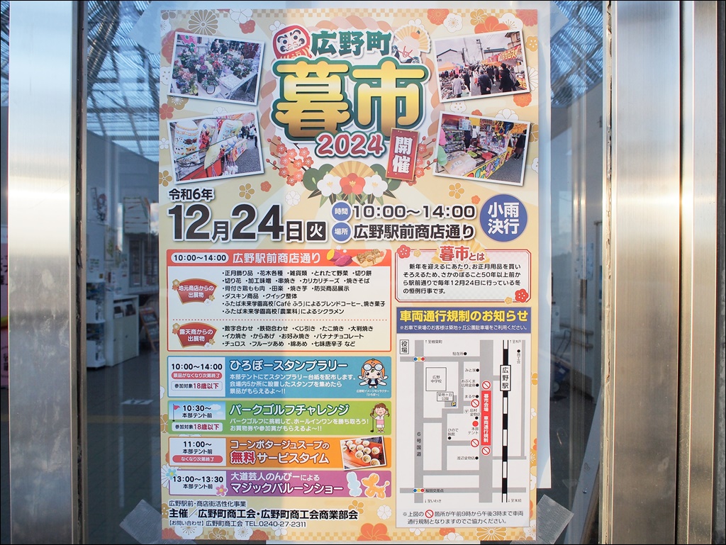 12/24 広野町暮市2024に出店します!! [ 新着情報 ] 2024年12月22日(日曜日) 令和6年12月24日(火)の広野町暮市2024に出店します!! 広野町産バナナ「綺麗」や山ぶどうサイダー、ふたば未来学園 絶品スイーツ3点セット、ひろぼーグッズを販売します。場所は広野駅前商店通りで、時間は午前10時から。皆さまお誘いあわせのうえ、ぜひ来場ください。 詳しくは広野町公式ホームページをご覧ください。 <会場> 広野駅前商店通り