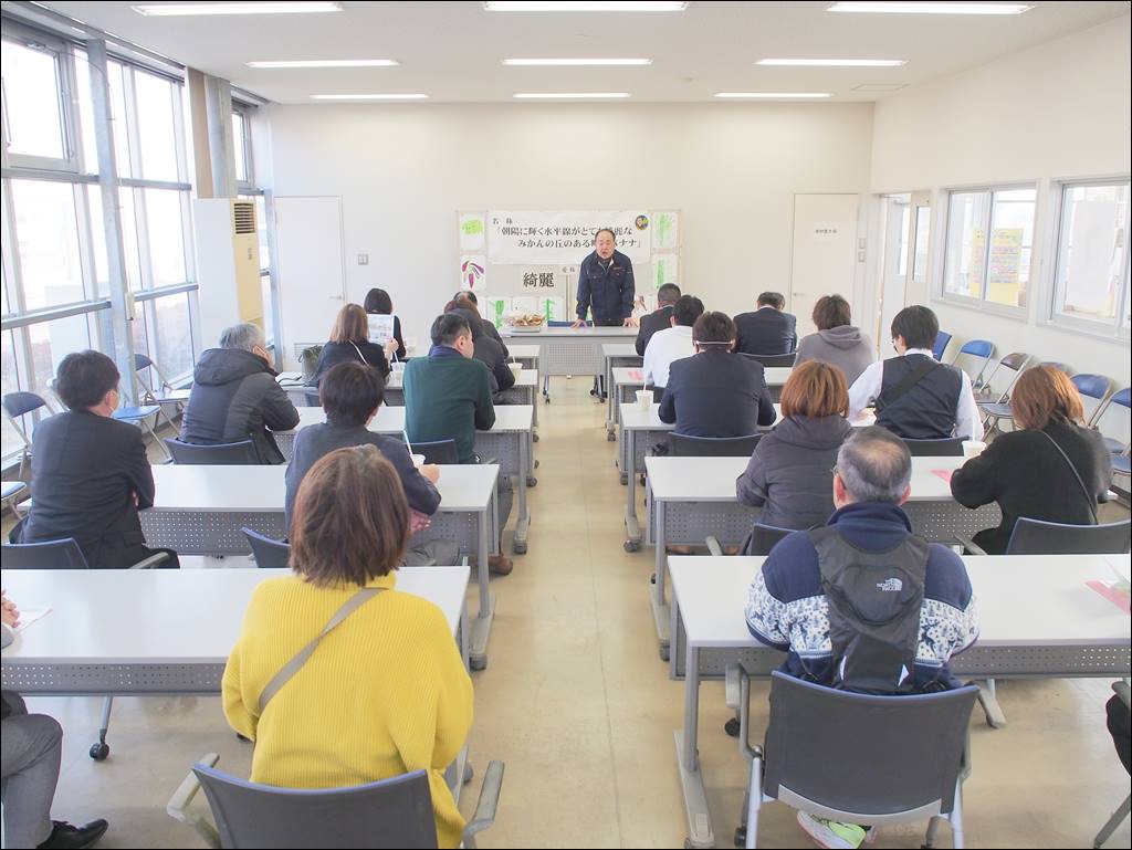 1/19 さいたま市地区労福協様が見学にいらっしゃいました [ フルーツ栽培 ] 2025年1月19日(日曜日) 令和7年1月19日(日)にさいたま市地区労福協様20名が見学にいらっしゃいました。 バナナジュースを飲みながら被災地広野町の新たな創生に向けた取り組みを聞かれました。その後でビニールハウスで「綺麗」を見学。記念に写真を撮られたり、バナナ1本につき実はいくつ採れるかなど質問されました。 最後にふたば未来学園の生徒がつくった焼き菓子3点セットなどを購入されました。