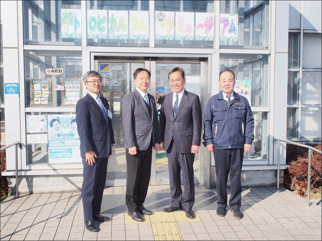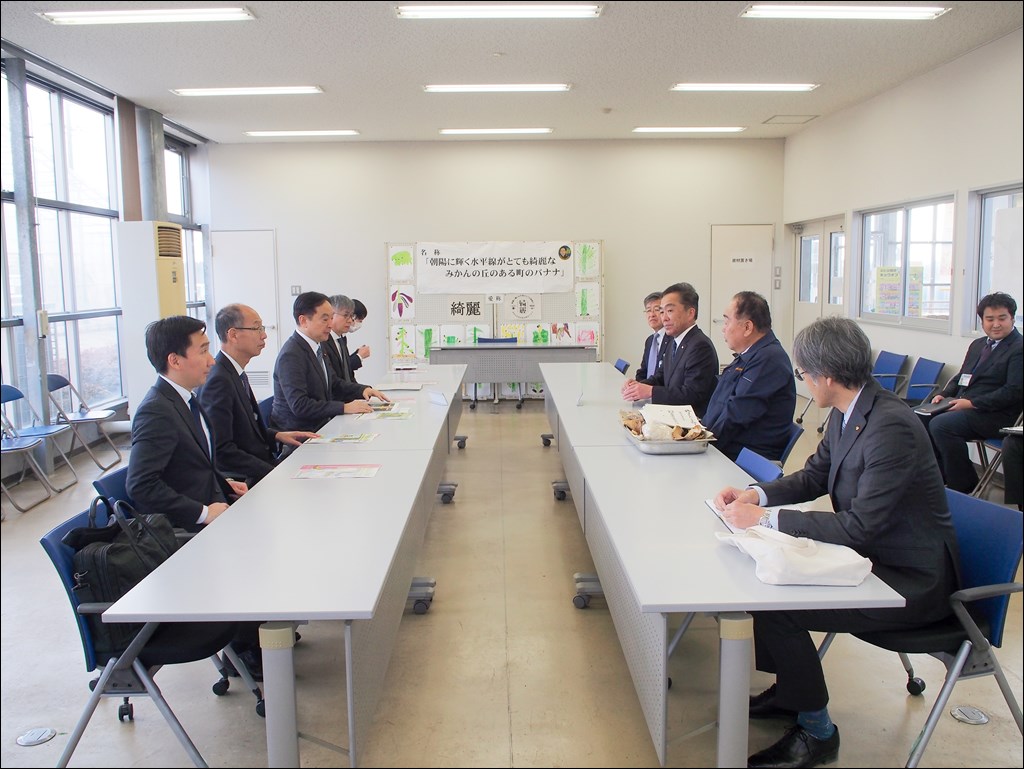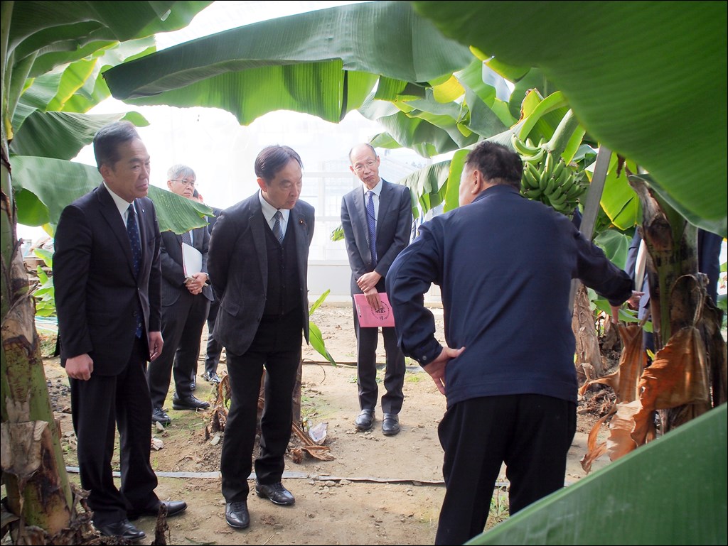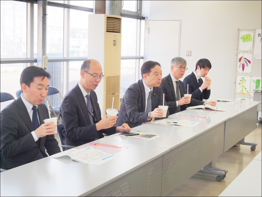 輿水復興副大臣が視察にいらっしゃいました [ フルーツ栽培 ] 2025年1月22日(水曜日) 令和7年1月22日(水)に輿水恵一復興副大臣が視察のためトロピカルフルーツミュージアムにご来訪されました。 被災地広野町の新たな創生に向けた取り組みについて聞かれ、話の合間にバナナジュースを召しあがりました。その後、ハウスでバナナ「綺麗」や地中熱システムを視察。地中熱システムの費用削減効果やCO2削減効果を聞かれたり、「綺麗」から発見された酵母菌についてなどを聞かれました。