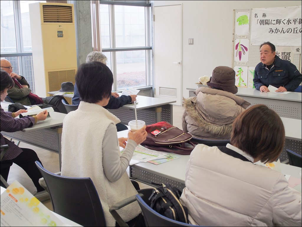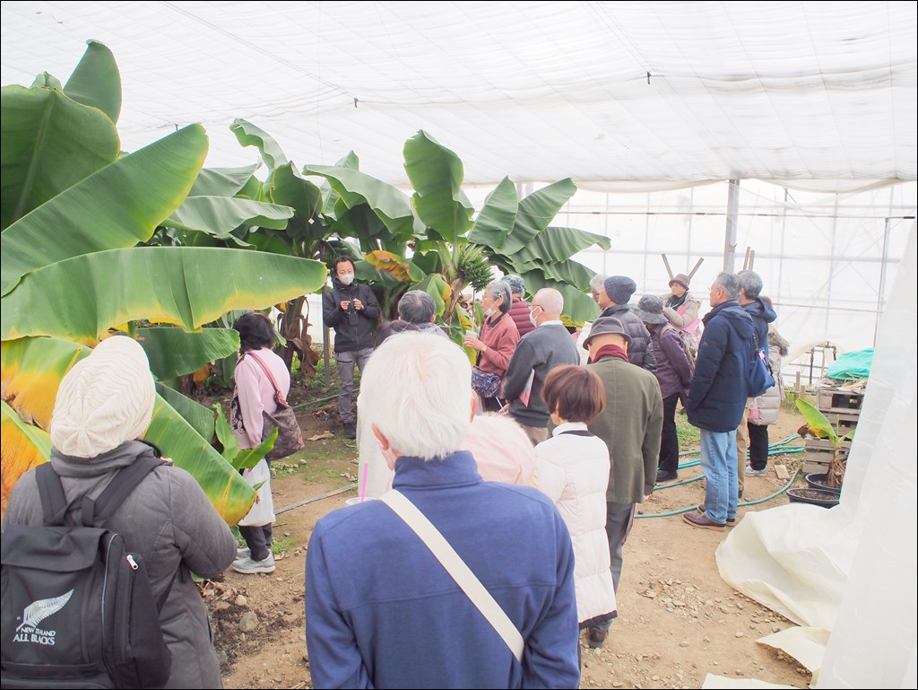 1/26 阪急交通社様がツアーで見学にいらっしゃいました [ フルーツ栽培 ] 2025年1月26日(日曜日) 令和7年1月26日(日)に阪急交通社様がツアーで20名見学にいらっしゃいました。 被災地広野町の新たな創生に向けた取り組みについての説明を聞かれた後、ハウスでバナナ「綺麗」の見学をされました。見学の後は「綺麗」やみかんジュースの購入や、アルパカのココアに会いに行ったりと、出発時間まで自由に過ごされました。
