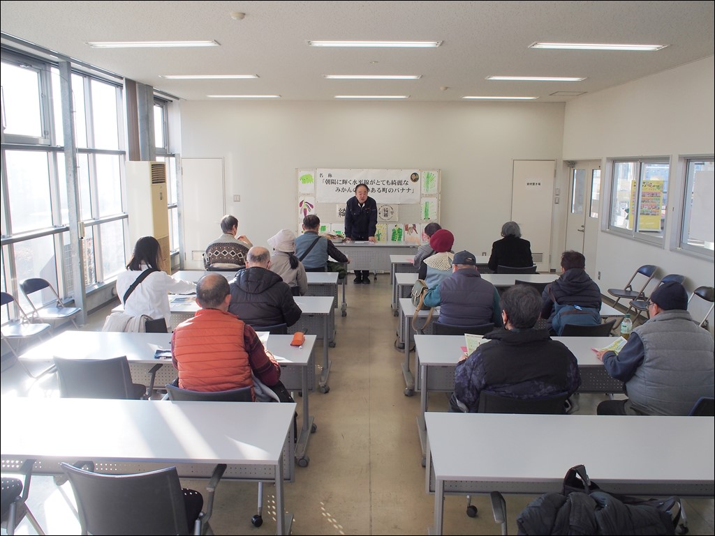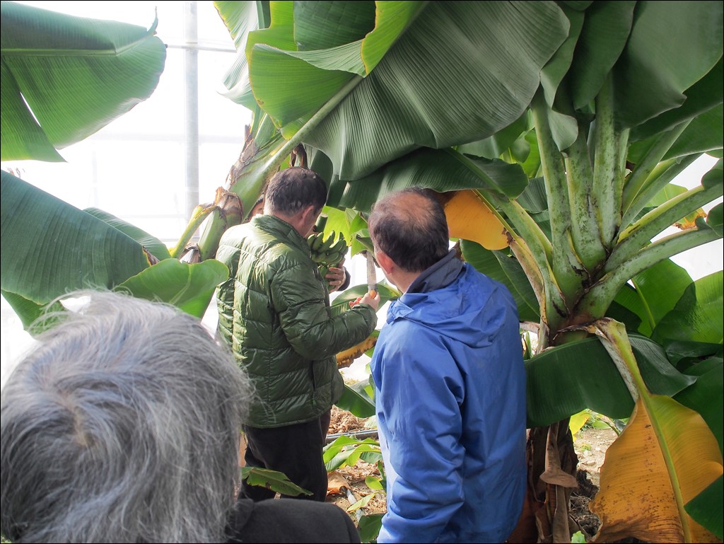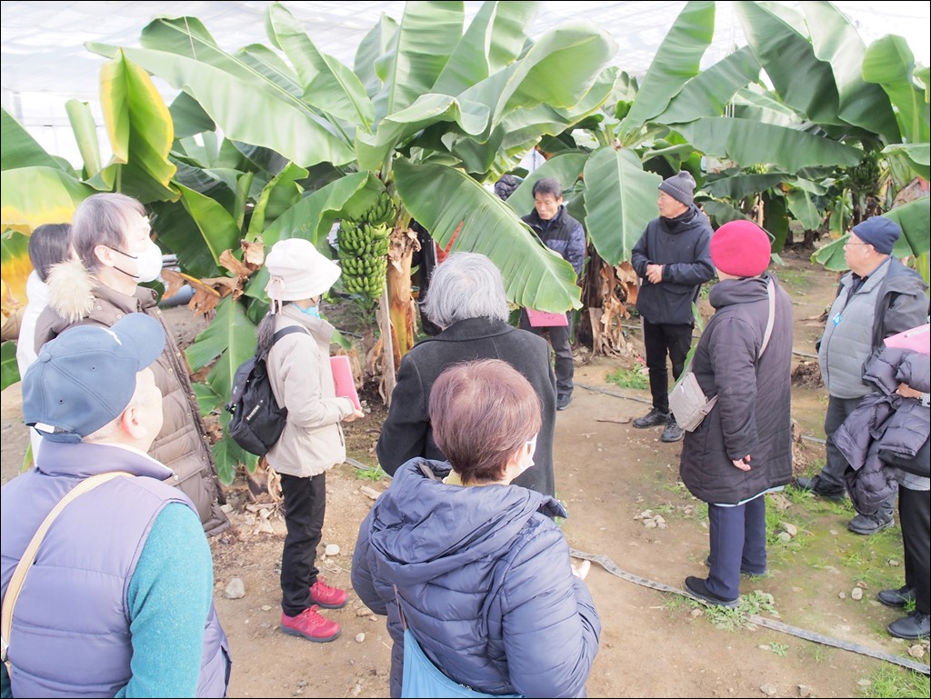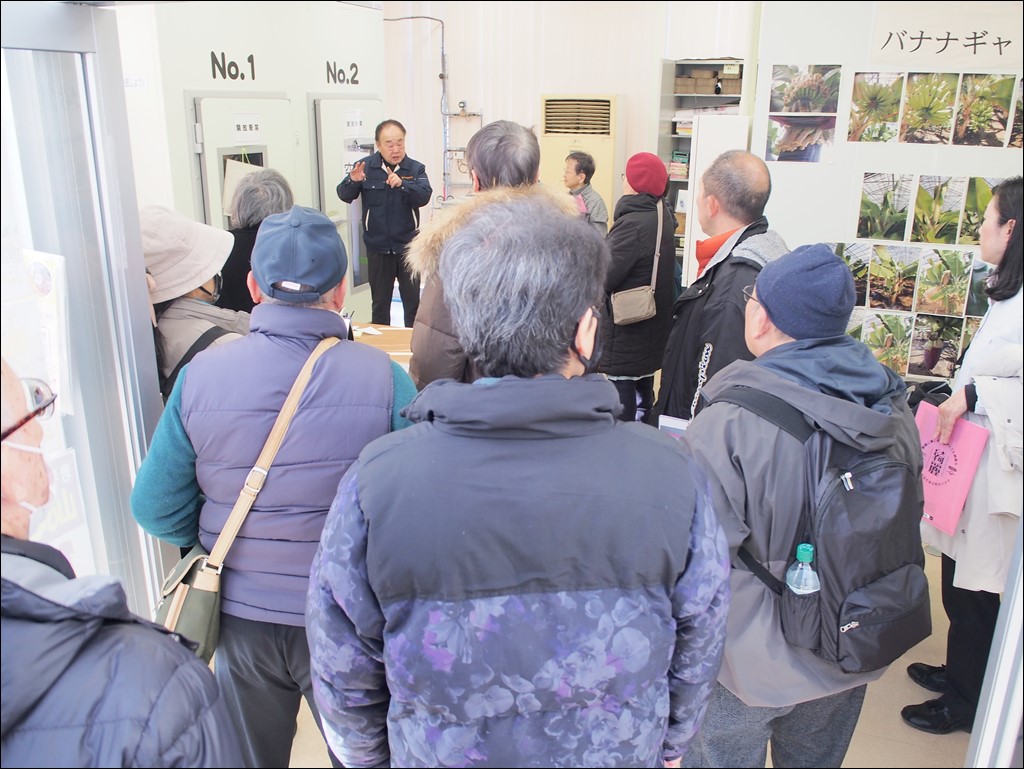 2/9 阪急交通社様がツアーで見学にいらっしゃいました [ フルーツ栽培 ] 2025年2月9日(日曜日) 令和7年2月9日(日)に阪急交通社様のツアー13名が見学にいらっしゃいました。 被災地広野町の新たな創生に向けた取り組みについての説明を聞かれた後、ハウスでバナナ「綺麗」の見学をされました。今回は収穫の時間と重なり、特別に収穫をお客さまに手伝っていただきました。見学の後はみかんジュースなどを購入されて、次の目的地へ向かわれました。
