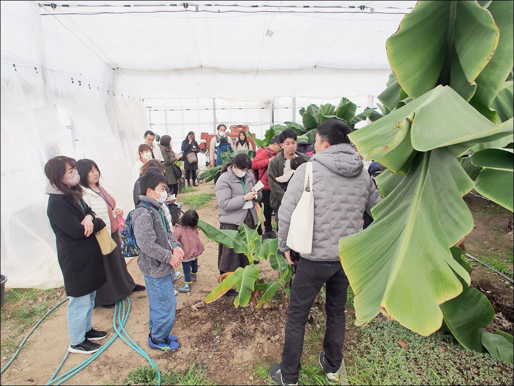 3/15 広野町移住定住ツアー様が見学にいらっしゃいました [ フルーツ栽培 ] 2025年3月15日(土曜日) 令和7年3月15日(土)に広野町移住定住ツアー26名様が見学にいらっしゃいました。 広野町役場職員の案内でハウスを見学。バナナ「綺麗」を育てる前にハウスで何を育てていたかや、バナナの追熟について、どこで販売しているかなどが説明されました。説明の後は自由時間で、各自自由に見学され、バナナの花の観賞や記念撮影などをされました。ハウス見学の後はレストランへ食事に向かわれました。