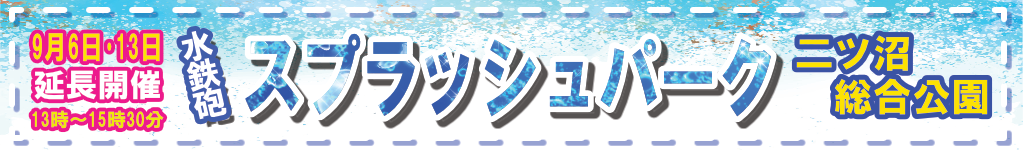 水鉄砲スプラッシュパーク延長開催(9/6・13) [ 二つ沼総合公園 ] 2025年9月2日(火曜日) 令和7年9月6日(土)・13日(土)に水鉄砲スプラッシュパークを延長開催します。8月は暑すぎて参加できなかった人も、1度参加された方も大歓迎!!好きな水鉄砲を選らんで、決められたエリア内で自由に遊ぶ楽しい催しです。無料です。ぜひお越しください!! 水鉄砲のお持ち込み大歓迎です。レンタルの水鉄砲は、混雑時は30分を目途に交代をお願いします。受付はふれあいドーム、時間は午後1時~3時30分まで。 詳しくはこちらをご覧ください。 開催日時 ・9月6日(土) ・9月13日(土) 時間:午後1時~3時30分