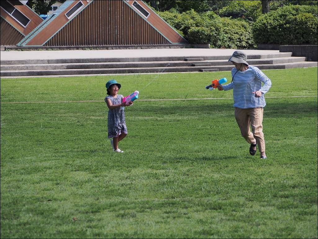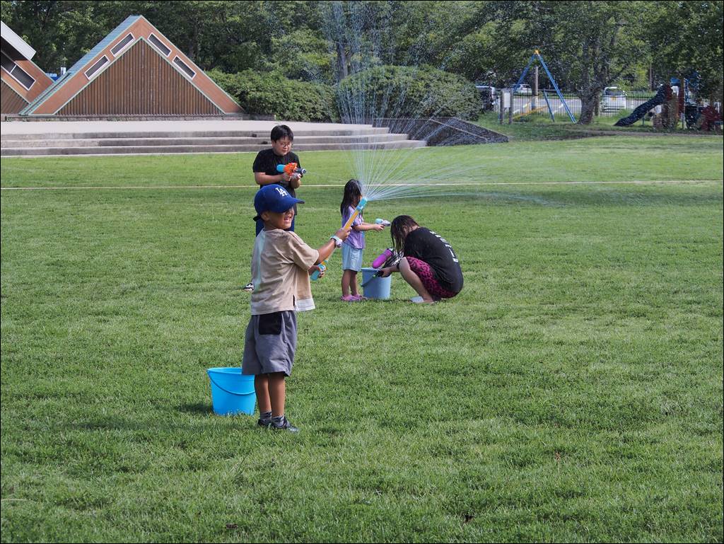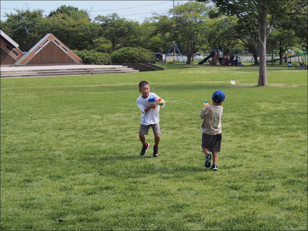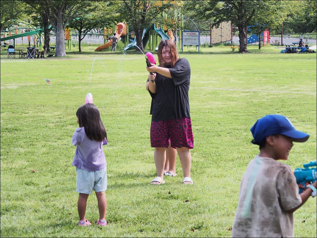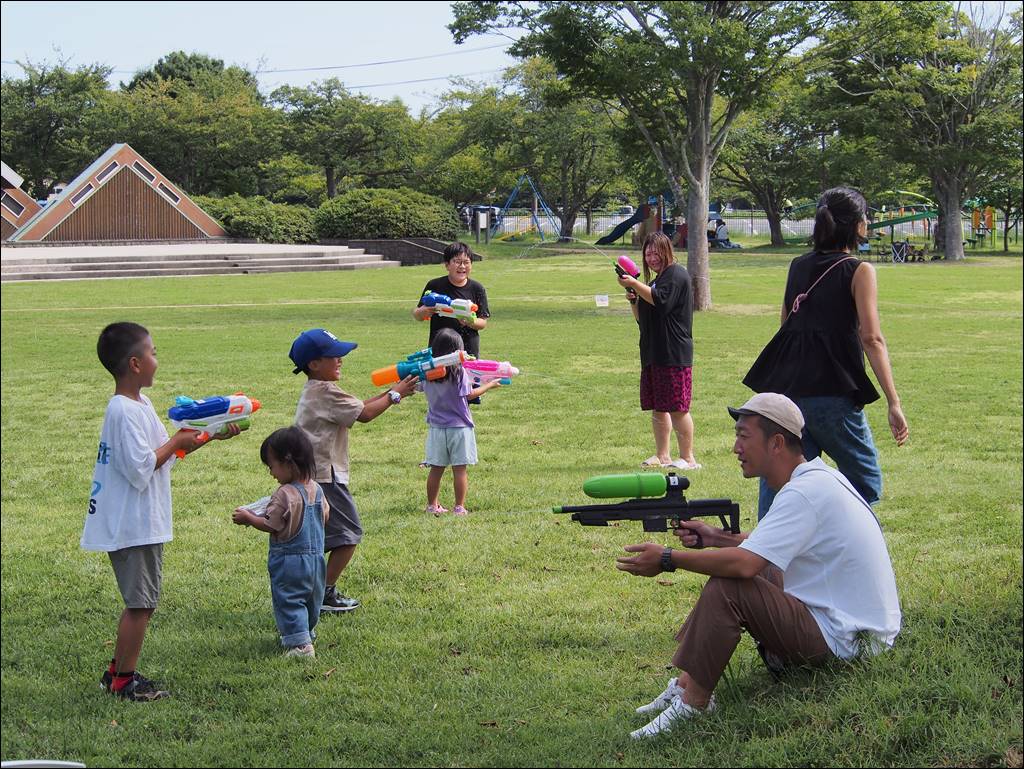 9月入って暑さが和らぎ、水鉄砲日和のよい天気となり、たくさんの方に参加していただきました。水鉄砲だけでなく、ふわふわドームなどの遊具でも遊んでくれて公園はとても賑やかになりました。