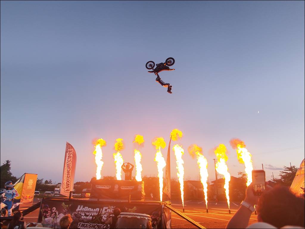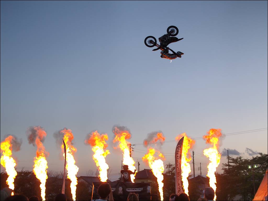日暮れの中、火柱の演出とライダーたちのダイナミックなパフォーマンスに加え、広野昇龍太鼓のコラボで観客を魅了しました。