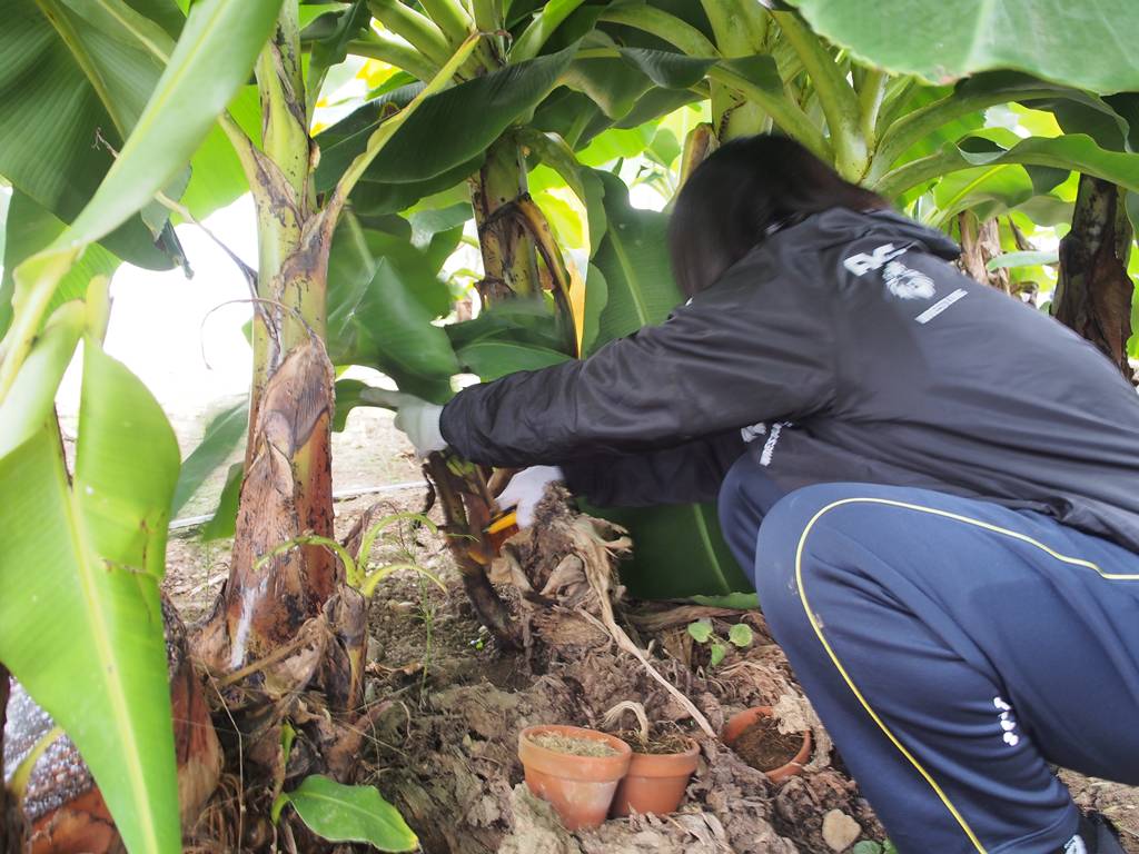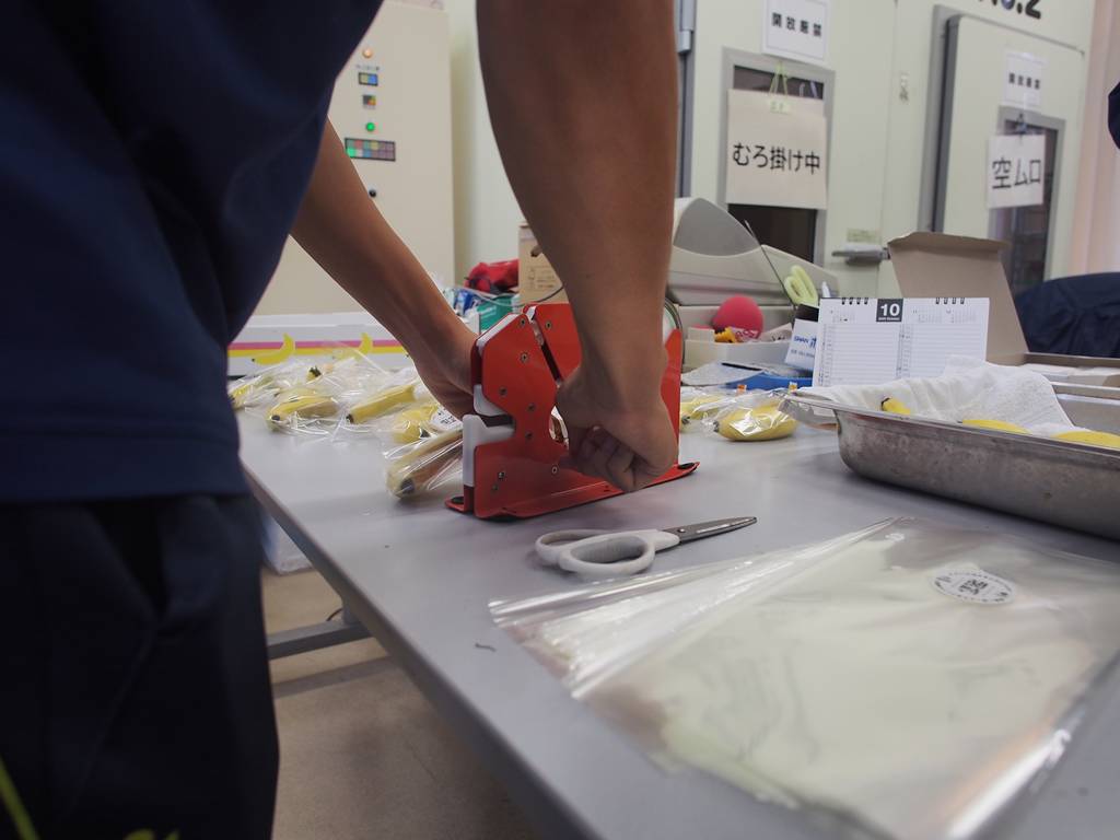 午前中は、バナナの袋詰めや、昨日と同様に視察などで配布する資料の準備、たまたまご来園されていた団体のお客様へのバナナジュース提供の対応も手伝っていただきました。