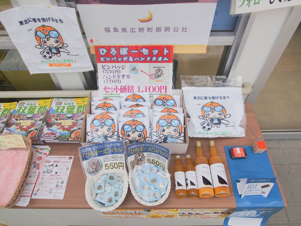 ふたば未来学園バナナ焼き菓子3点セットや広野町のみかんジュース、みかんサイダー、ひろぼーグッズの販売は行っています。また、バナナ「綺麗」を栽培しているハウス見学ができます。