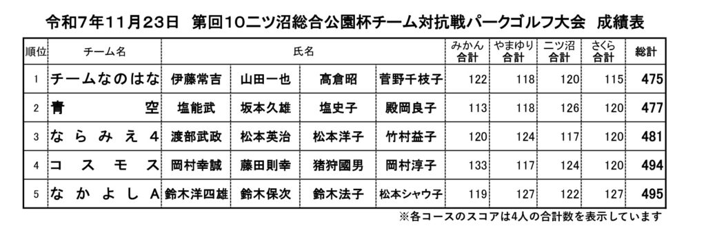 11/23開催 第10回二ツ沼総合公園杯チーム対抗戦パークゴルフ大会に関して [ パークゴルフ ] 2025年11月23日(日曜日) 11/23に開催したパークゴルフ大会の上位5チームの成績を掲載します。 二ツ沼総合公園パークゴルフ場では、月に数回上記のような大会を開催しております。 みなさまのご参加をお待ちしております。