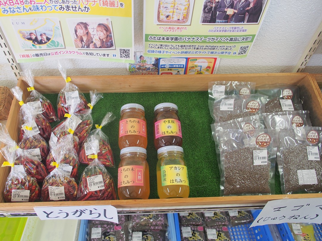 小名浜海星高校様の「わたあめ」やワークセンターさくら様の「こんにゃく」、小林とうふ直売所様の「豆腐」などもあります。更に国産はちみつや梅干しの販売もございます。ぜひお立ち寄りください。