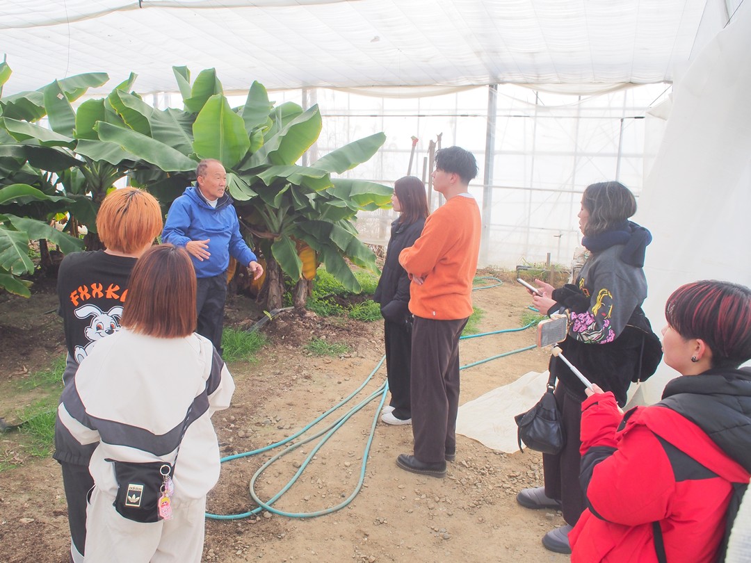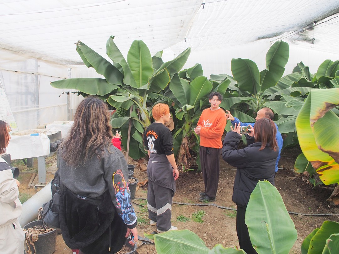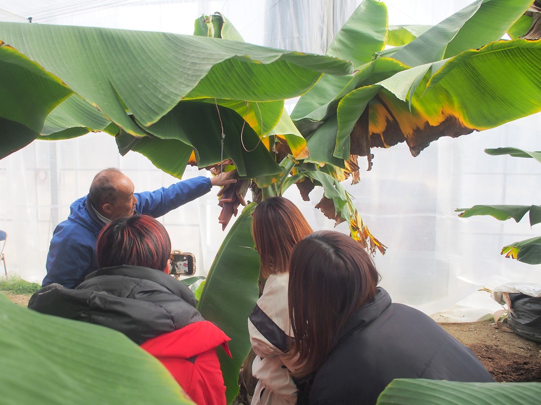はじめにビニールハウスで、バナナ「綺麗」が育つ様子を見学。