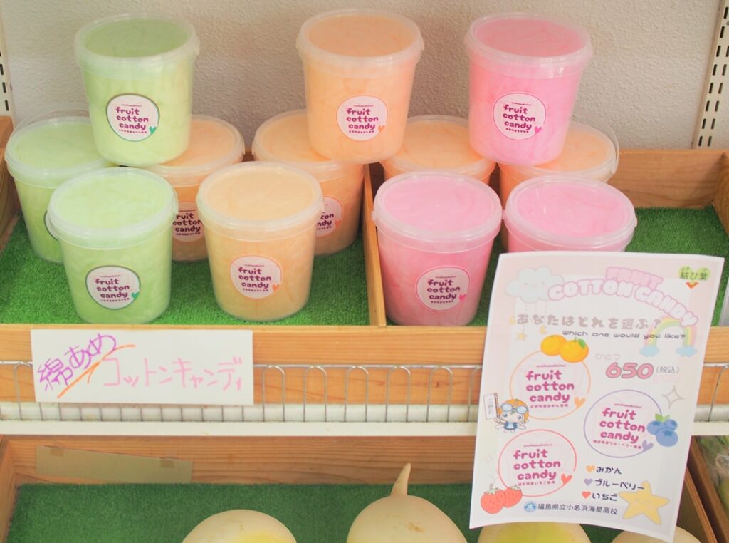 みかんサイダーと同じく、小名浜海星高校の商品です。バケツカップ入り綿菓子で、広野町産のみかん、いわき市産のキウイ、鏡石町産のいちごをそれぞれ使用しています。見た目が可愛く、日持ちもするので、お土産にピッタリです。