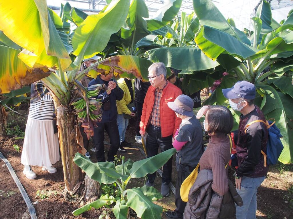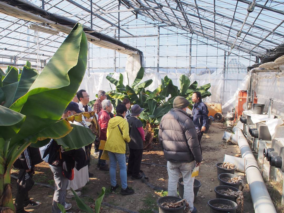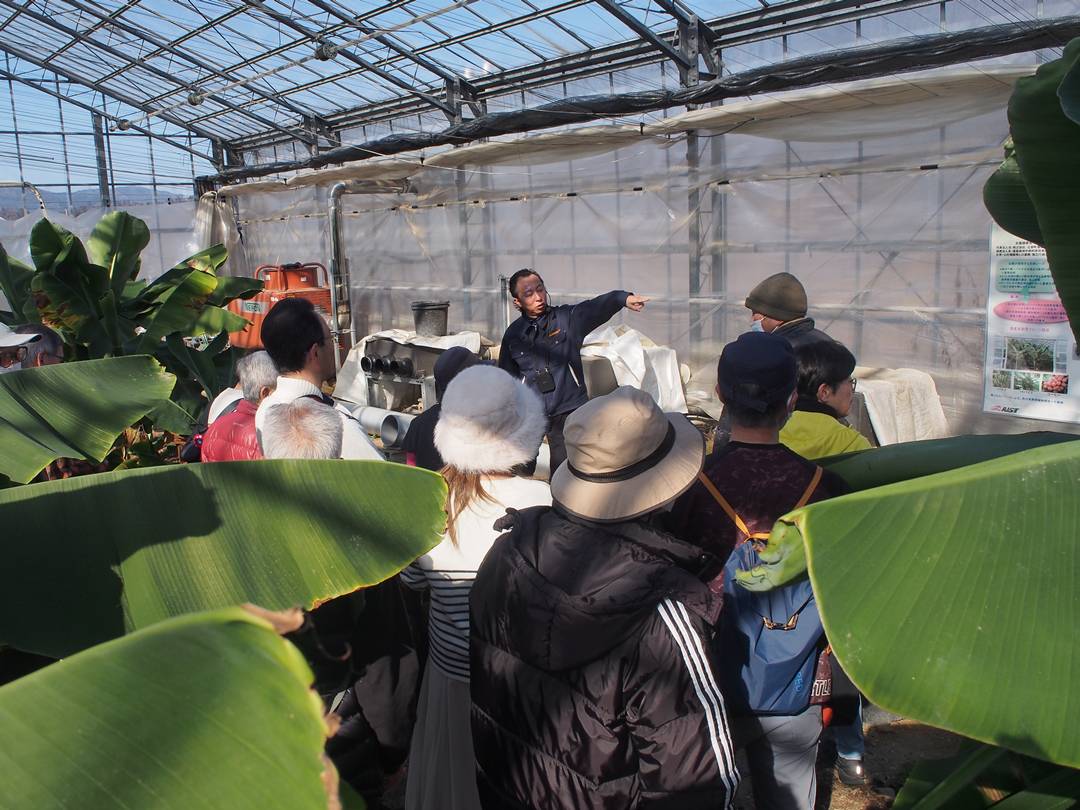 ハウスの中では南国のような環境の中で育つバナナ「綺麗」の様子を間近でご覧いただき、栽培の特徴についても関心深く耳を傾けてくださいました。