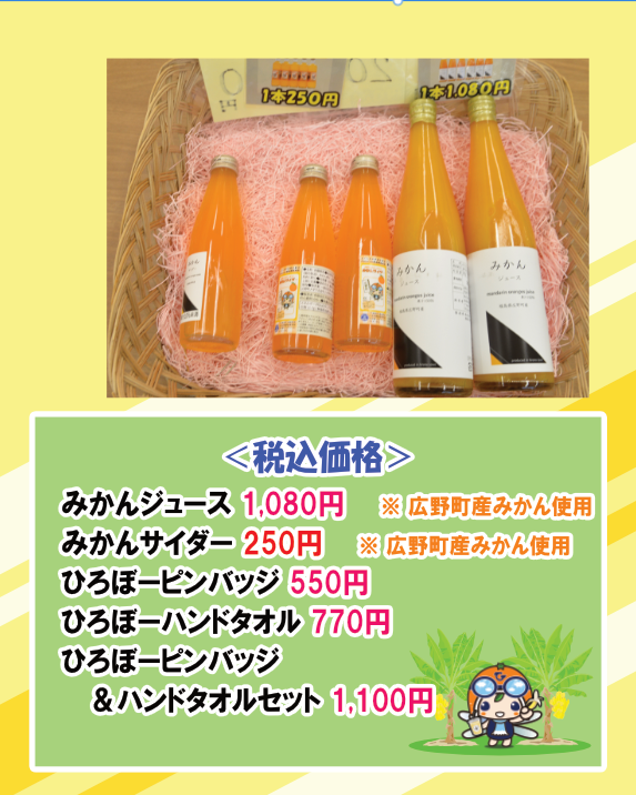 みかんジュースやひろぼーグッズの販売は行っております。バナナ「綺麗」を栽培しているハウス見学もできます。