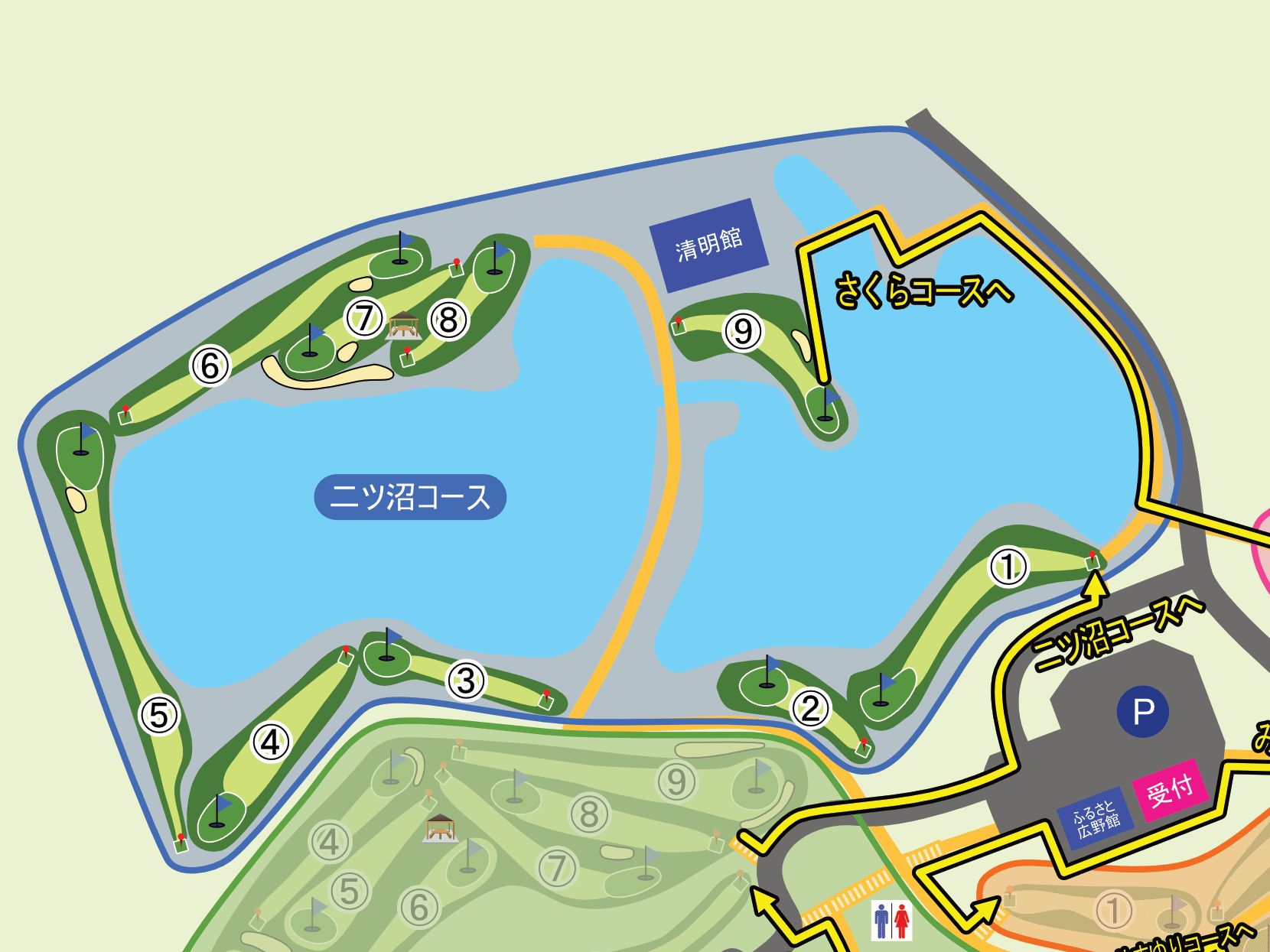 4コースの中で最長と最短のホールがある。二ツ沼を囲った美しい景観の中でプレーできる。直線的で短いホールも多いが、うねりや砲台グリーンなどの地形の攻略が楽しい。