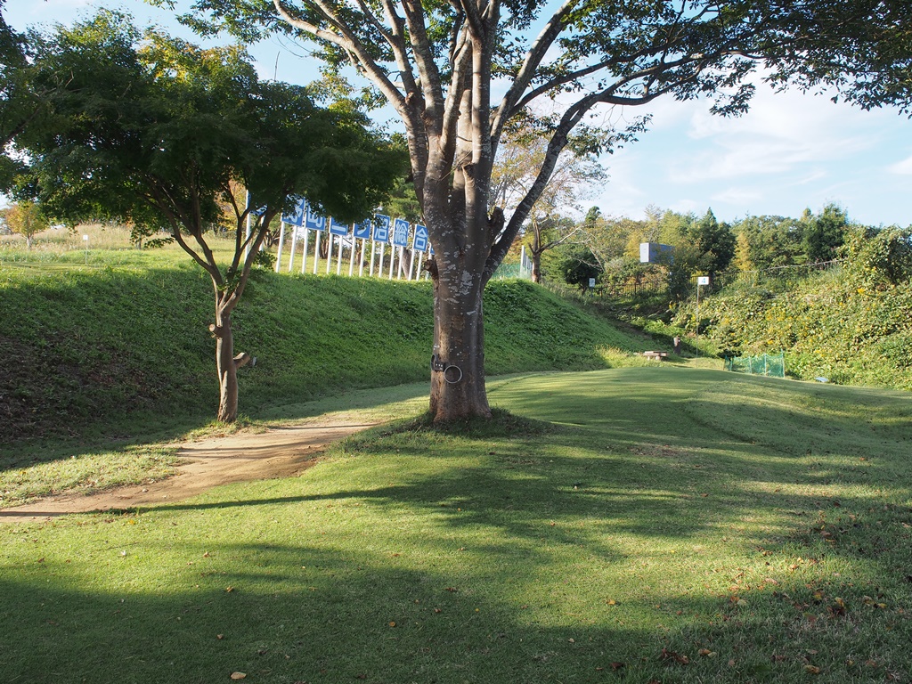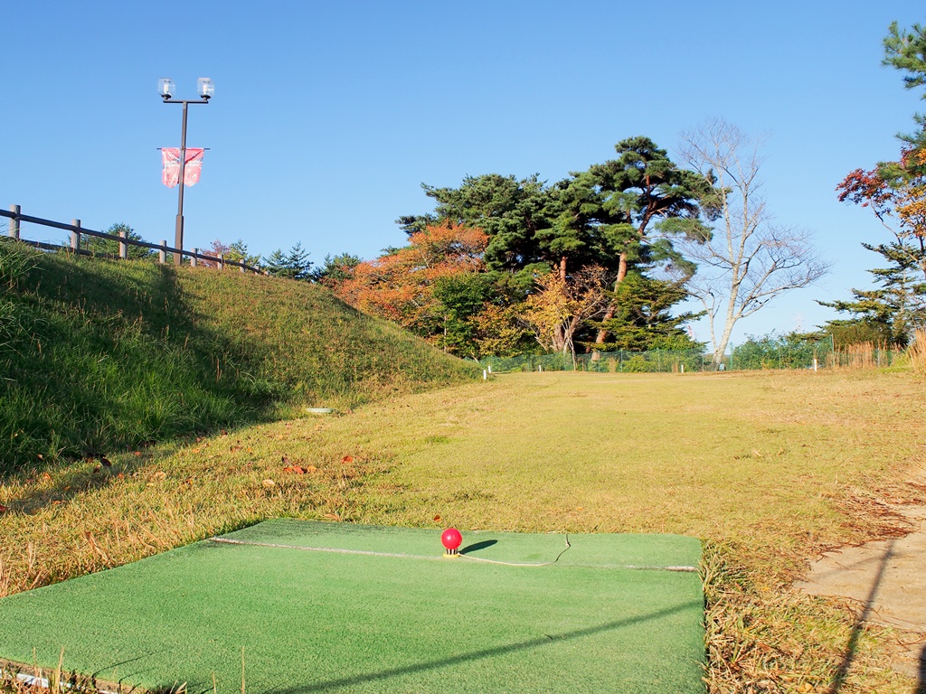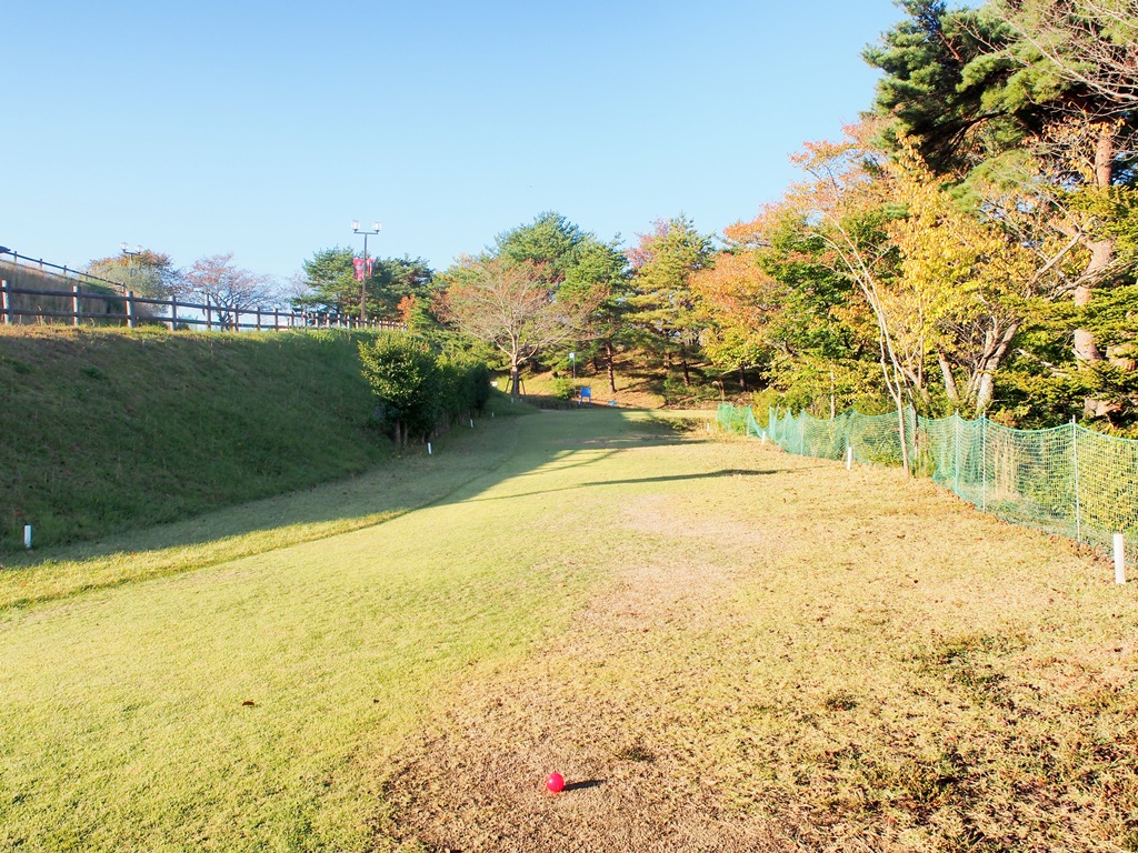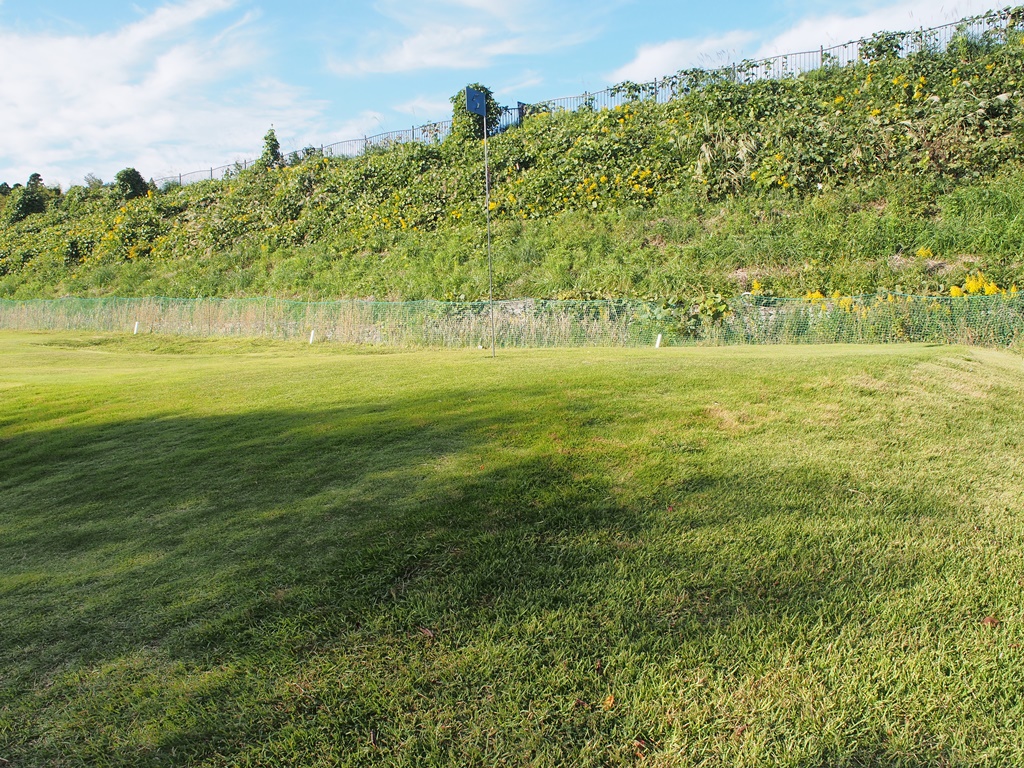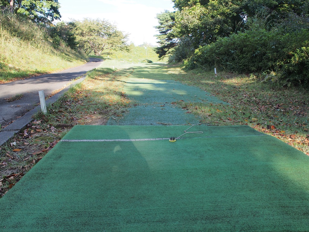 もう1つの打ち方として、左の斜面へ打つ方法もあります。斜面から戻る反動で中央に寄せることも可能です。ラフを通るので強いショットが打てない方には向きません。