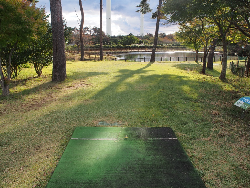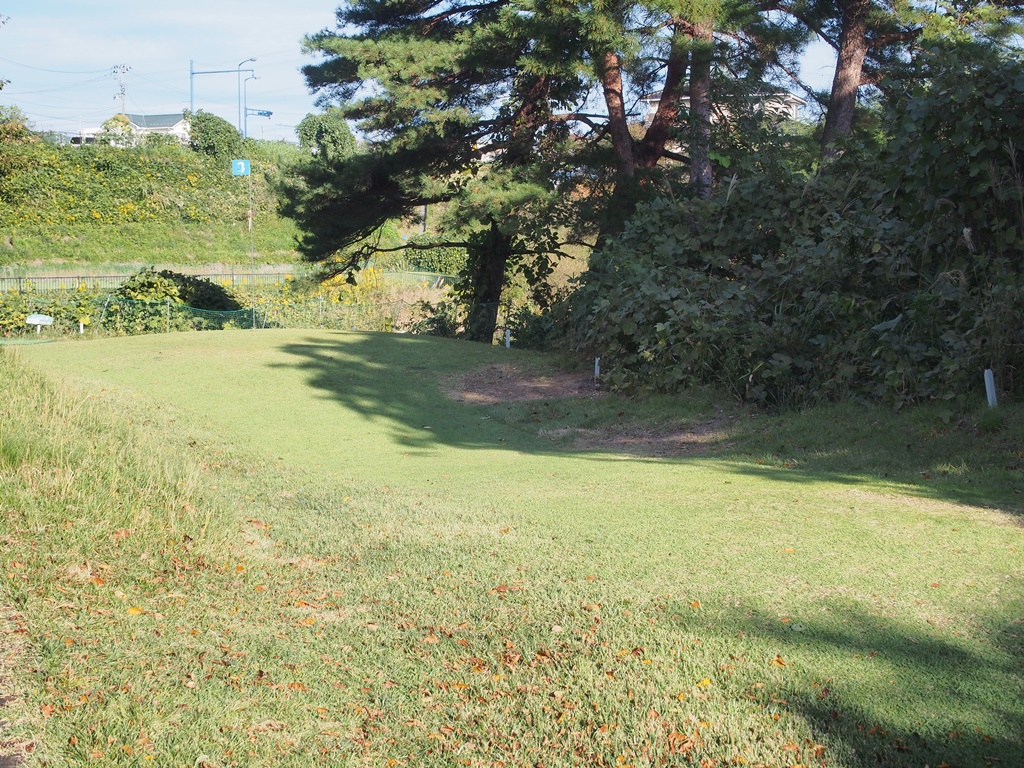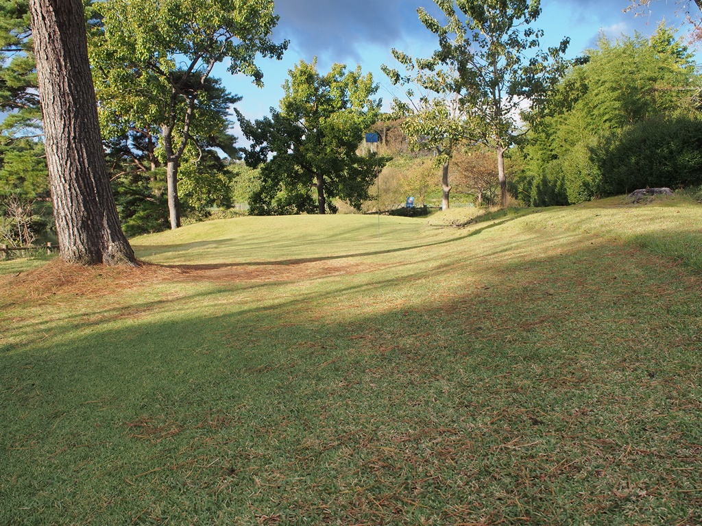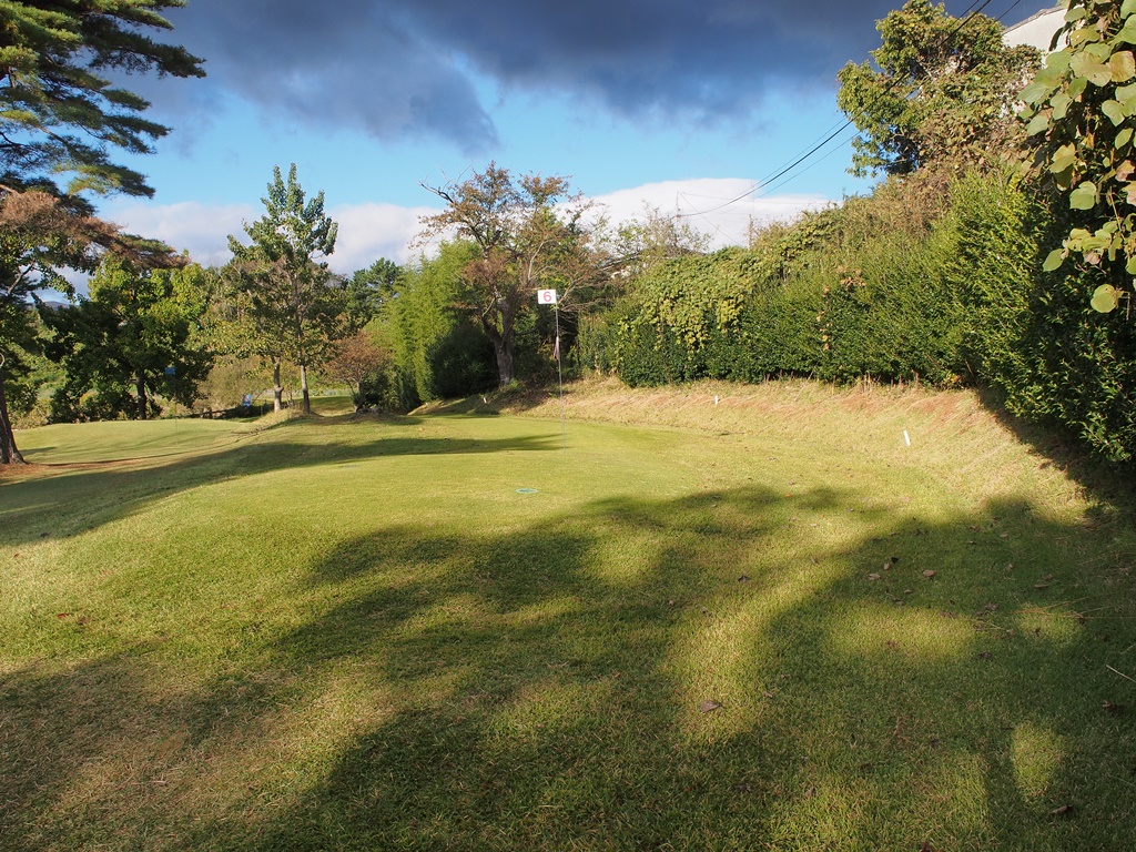 第1打は正面に軽く打ってコーナーで止めます。やや下り傾斜で、加減を間違えるとOBになります。コーナーからは、樹木の間を抜けてグリーンを狙います。グリーンから落ちてOBになる可能性もあるので注意。