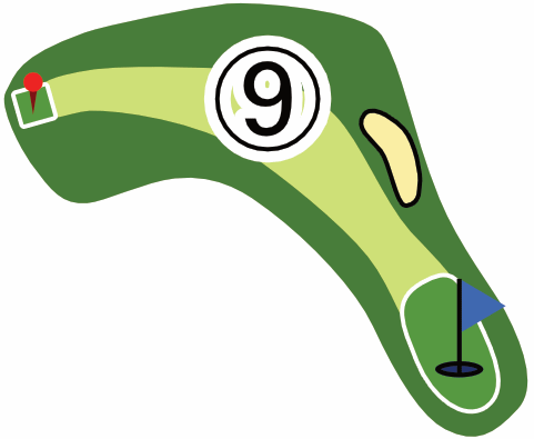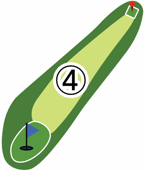 右ドッグレッグのショートホールで、グリーンまで緩やかな下り傾斜が続きます。