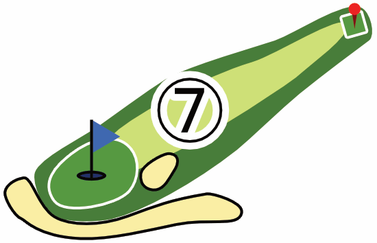 起伏のあるグリーンが多くあります。傾斜で転がってしまい、カップから遠ざかることもあります。まずはボールを止めやすいところを狙い、次の1打で着実にカップインさせるのも攻略法の1つです。カップ近くで何打も打ってしまわないようお気を付けください。